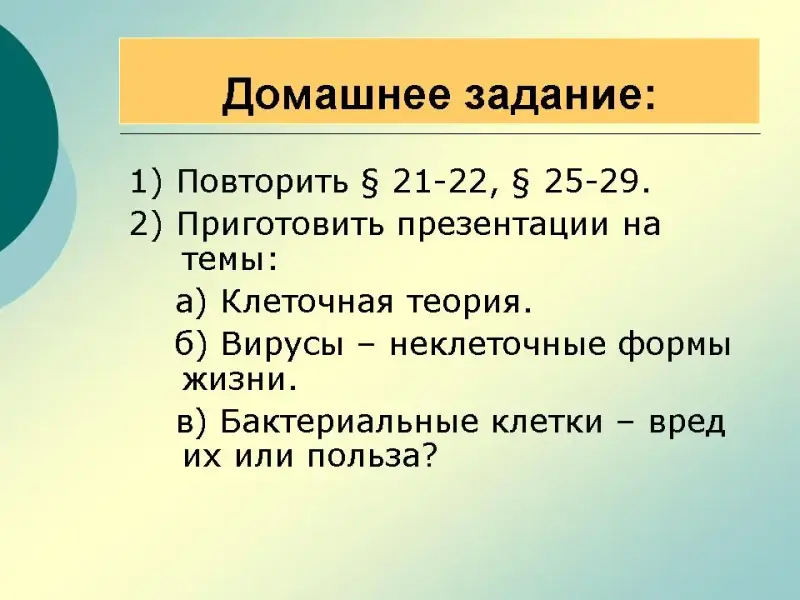 2) Приготовить презентации на темы: а) Клеточная теория. б) Вирусы - неклеточные формы жизни. в) Бактериальные клетки - вред их или польза? |