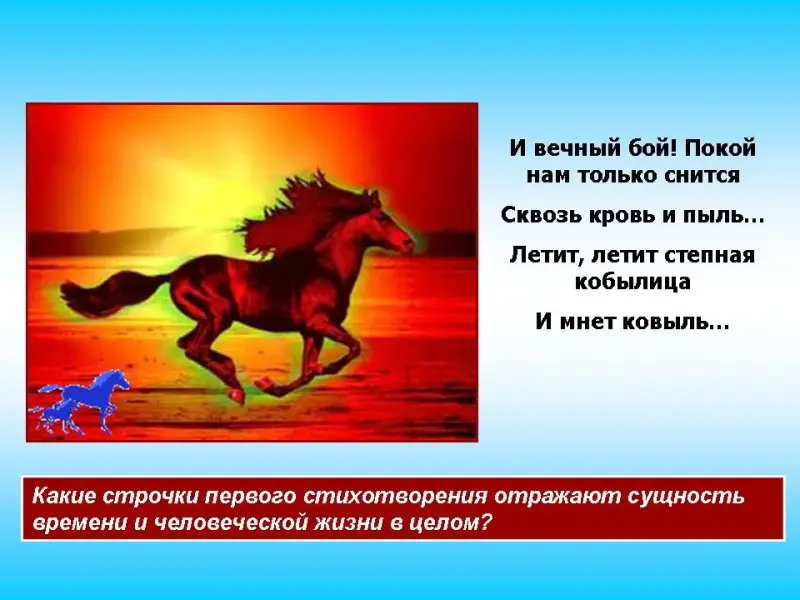 Слайд №12. Образу реки противопоставлен образ летящей степной кобылицы. Повтор "летит, летит" меняет ритмику стиха. Одно мгновение, и уже закат в крови. Напряжение нарастает, и уже в последующих строфах сплошь восклицательные предложения. Умолчания подчеркивают быстрое течение времени, создают впечатление некоторой недосказанности. Покоя нет! Стремительность событий подчеркивается и аллитерацией звуков "с" в 4-й и "р" в последней строфе стихотворения.