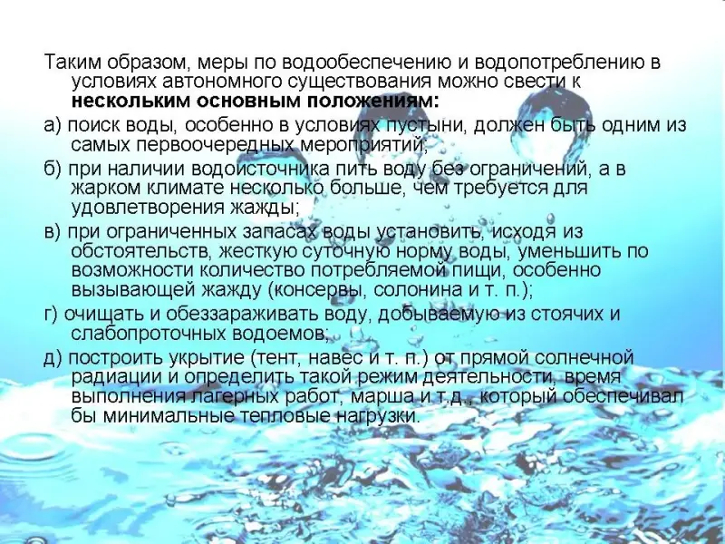 | Слайд 1 | Человеческий организм почти на 65% состоит из воды. Обезвоживание организма всего на несколько процентов ведет к нарушению его жизнедеятельности, а свыше 10% вызывает глубокие нарушения, которые могут привести его к гибели. Поэтому в условиях автономного существования, особенно в районах с жарким климатом, при ограниченных запасах воды или при их отсутствии, обеспечение водой становится проблемой первостепенной важности. Ежедневно человеческий организм теряет 2-3 литра воды. Потеря жидкости через дыхание и потоотделение увеличивается с интенсивностью работы и повышением температуры. Взрослый человек может прожить без пищи три недели, а без воды - только три дня, поэтому не надо ждать когда кончится вода, чтобы приступить к пополнению ее запасов. Некоторое количество воды необходимо хранить в качестве аварийного запаса и постоянно искать новые источники чистой питьевой воды. |