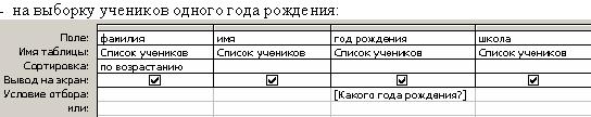 В MS ACCESS для формирования запросов существует специальное средство - конструктор запросов. Существует универсальный язык, на котором формулируются запросы во многих СУБД. Это - SQL (Structured Query Language) - структурированный язык запросов. Близким к нему является учебный гипотетический язык, более понятный учащимся, т. к. в нем используются русские служебные слова. Впрочем, использовать такой подход к обучению или нет, учитель решает сам. Как вариант, я хочу предложить небольшую разработку по этому вопросу. Могут быть варианты комбинированного подхода - более сильные ученики используют сразу конструктор запросов, но создают больше различных запросов и, кроме того, более сложных запросов. Ученики менее подготовленные работают с использованием гипотетического языка.