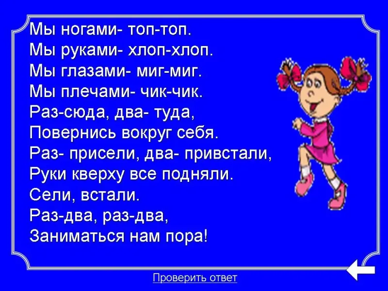Работа оформлена в виде Презентации. Слайд 2 - основной, с остальными слайдами, на которых написаны задания, работают по гиперссылкам по щелчку мыши. Чтобы вернуться к слайду 2, необходимо нажать на стрелку. На слайде 2 есть звёздочка - это физкультминутка, чтобы её провести, нужно нажать на звёздочку, а после этого на стрелку, чтобы снова вернуться к слайду 2.