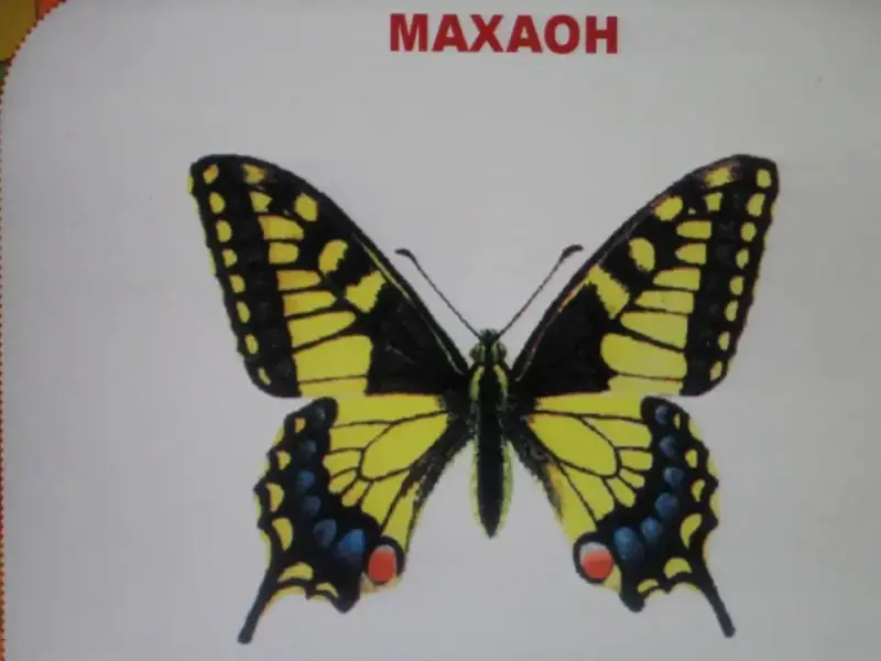 - Это бабочка - Махаон. С изящной формой крыльев. Сколько цветов присутствует в ее окраске! Давайте подсчитаем. Из чего слагается узор ее крыльев?