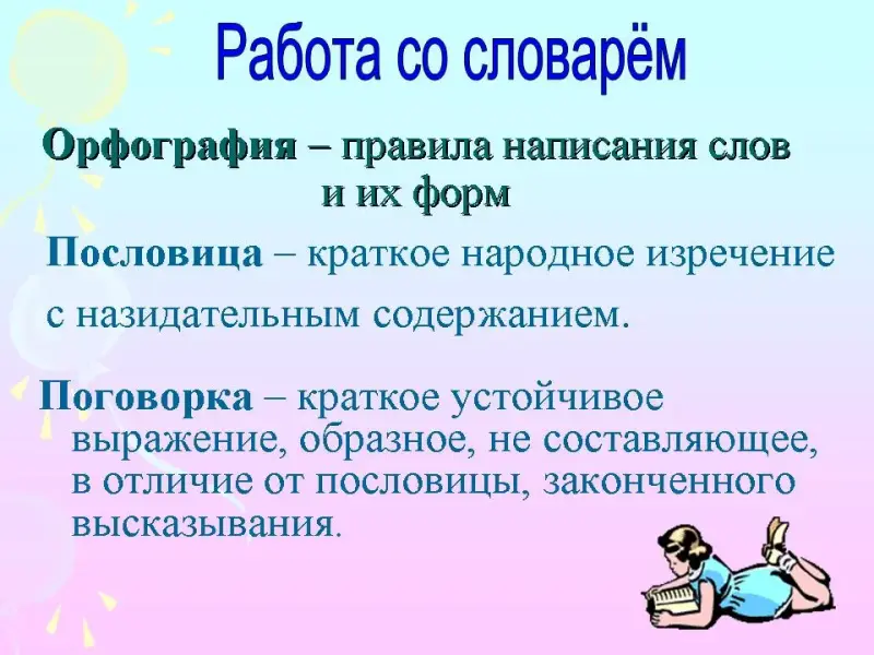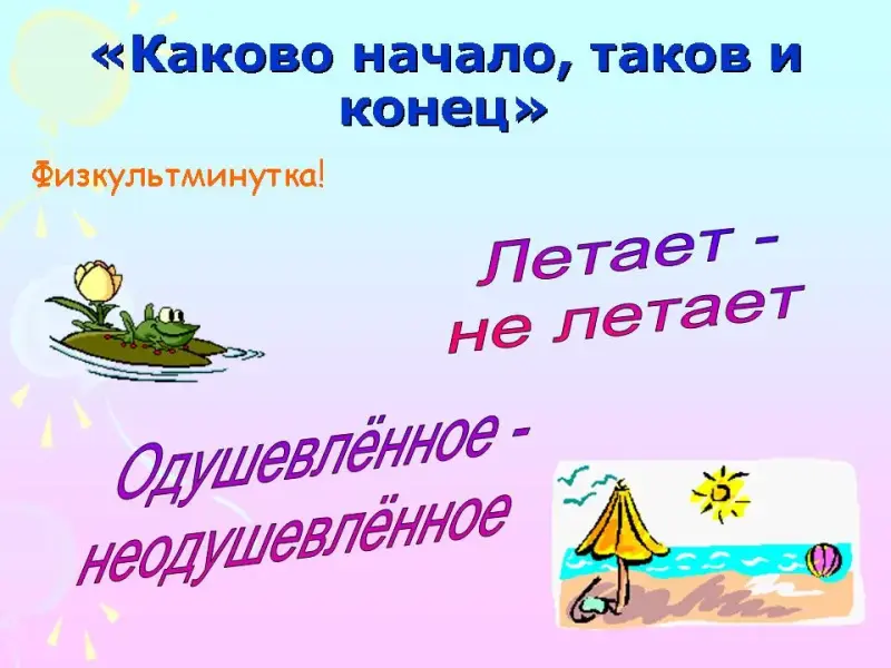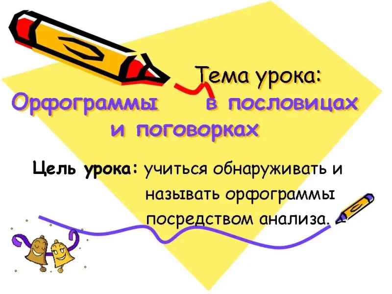 - Сегодня мы поговорим об орфограммах, которые прячутся в пословицах и поговорках. II. Минутка чистописания. Проверка знаний по фонетике, морфемике, орфографии и графике. - Ребята, я загадала слово. Вы сейчас будете отгадывать буквы, и записывать в тетради заглавную и строчную, а затем попробуете переставить эти буквы и получить слово, которое я загадала. - Буква удвоенного согласного в слове длинный.(н) - Буква безударного гласного в приставке слова записка.(а) - Буква безударного гласного в корне слова малина.(а) - Буква непроизносимого согласного в корне слова солнце.(л) - Буква безударного гласного в суффиксе слова молодость.(о) - Буква непарного мягкого согласного звука в слове грач.(ч) (Нн Аа Аа Лл Оо Чч) - А теперь составьте слово: Начало - Правильно, молодцы! III.Подготовка к восприятию нового материала. - Ребята, началом грамотности каждого человека является знание орфограмм русского языка. Поэтому очень важно умение видеть и применять их на письме. - Обратимся к словарю С.И.Ожегова и вспомним, что такое орфография. Орфография - правила написания слов и их форм. - Следующий шаг. Чтобы нам было интересно находить орфограммы и закреплять их написание, мы будем работать с пословицами и поговорками. И снова нам поможет словарь: Пословица - краткое народное изречение с назидательным содержанием, народный афоризм. Поговорка - краткое устойчивое выражение, образное, не составляющее, в отличие от пословицы, законченного высказывания. - "Каково начало, таков и конец" - гласит русская пословица. Вы хорошо начали работать, продолжайте в том же духе. Молодцы! IV. Физкультминутка. Утром стрекоза проснулась