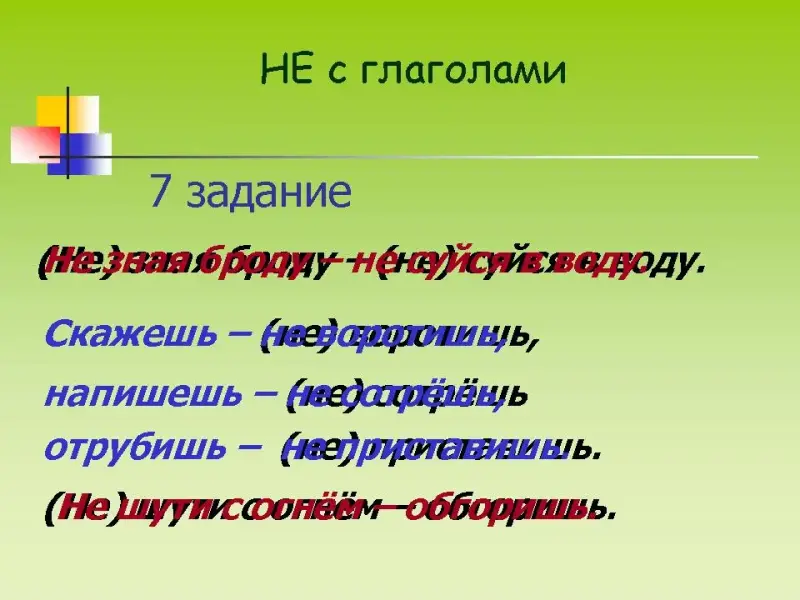 V. Восприятие, осмысление, усвоение новых знаний. - Ребята, для вас подготовлен раздаточный материал - таблица основных орфограмм и правописаний в русском языке. Это вам пригодится в работе на уроке. - Прочтите пословицы и поговорки, проанализируйте слова с пропущенными буквами и назовите орфограмму. 1 задание. (Буквы для обозначения безударных гласных в корне слова (проверяемые). Липнет, как см_ла к ст_не. Умён на сл_вах, да глуп на д_лах. Всякая с_сна в св_ём б_ру шумит. Н_га споткнётся, а г_л_ве достанется. - Как проверить данную орфограмму? Кто скажет правило? - Вставим пропущенные буквы, докажем свой выбор. - Выберите одну пословицу или поговорку, запишите в тетрадь, объясните смысл. 2 задание. (Буквы для обозначения парных звонких и глухих согласных в корне слова (проверяемые). Доброе слово человеку как дож_ь в засуху. Береги но_ в большой моро_. Гне_ - плохой советчик. В чужой ло_ке всегда больше ры_ки. 3 задание. (Непроверяемые гласные и согласные буквы в корне слова (словарные слова). На одной неделе семь пятниц. Пусти козла в огород. Мороз да метели под февраль налетели. Плотника не шуба греет, а топор. 4 задание. (Буквы для обозначения непроизносимых согласных в корне слова (проверяемые и непроверяемые). Ты только свис_ни, а я и сам осмыслю. Осторожность - мать безопас_ности.. Худо лето, когда со_нца нету. Рукам работа - душе праз_ник. 5 задание. (Раздельное написание предлогов и слитное написание приставок). (По)клоном поясницы не(пере)ломишь. (В) субботу - (на) работу,(в) воскресенье - (на)веселье. (На)звался грибом - (по)лезай (в) кузовок. Как(с) неба( с)валился. 6 задание. (Разделительные Ъ и Ь). Учен_е - путь к умен_ю. Терпен_е и труд всё перетрут. Не обойти, не об_ехать. Друз_я познаются в беде. 7 задание. (Не с глаголами). (Не) зная броду - (не) суйся в воду. Скажешь - (не) воротишь, напишешь - (не) сотрёшь, отрубишь - (не) приставишь. (Не) шути с огнём - обгоришь. (Не) зарься на чужое, своё береги! VI. Закрепление. 1. Театр - экспромт. - А сейчас поиграем и отдохнём. Игра непростая, а сказочная.