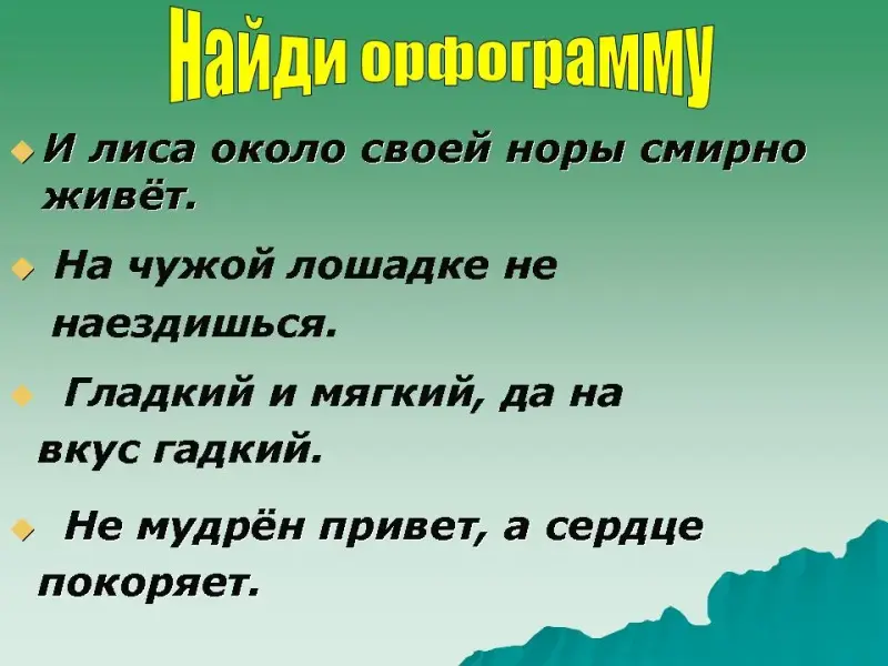 Выходят дети, в руках карточки: РЕПКА, ДЕД, БАБКА, ВНУЧКА, ЖУЧКА, КОШКА, МЫШКА. - Давайте сказку переиграем и сгруппируем наших героев по орфограммам: РЕПКА ДЕД ВНУЧКА КОШКА БАБКА ЖУЧКА МЫШКА 2. Найди орфограмму. - Ребята, посмотрите внимательно на пословицы и поговорки, внимательно их прочитайте и найдите орфограммы. И лиса около своей норы смирно живёт. На чужой лошадке не наездишься. Гладкий и мягкий, да на вкус гадкий. Не мудрён привет, а сердце покоряет. VII. Итог урока. - Ребята, понравилось вам работать на уроке? - Что особенно запомнилось? - Я желаю вам всегда грамотно, без ошибок выполнять все задания и письменные работы. - Вы очень хорошо работали. Спасибо за урок! |