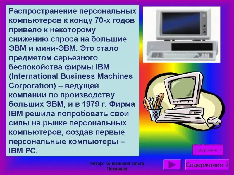 2. История электронно-вычислительных машин. По своему усмотрению учитель может использовать этот материал на разных этапах изучения курса. Нередко об истории ЭВМ рассказывается в самом начале, на первых уроках. Такое вполне возможно. Увлекательный рассказ о развитии компьютерной техники может поднять интерес учеников к предмету. Однако есть существенные аргументы за то, чтобы историю ЭВМ изучать в конце курса. Дело в том, что понимание этого материала требует от учеников определенной компьютерной грамотности. Если ученики еще ничего не знают о памяти и процессоре ЭВМ, о программировании, о круге задач, решаемых с помощью ЭВМ, то вряд ли они смогут понять рассказ о том, как развивались эти средства и возможности компьютера. Получив на уроках представление об устройстве и областях применения современного компьютера, ученики получат "точку отсчета", относительно которой они смогут оценивать технику предыдущих поколений.