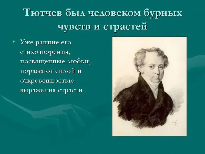 Обстоятельства личной жизни Тютчева содействовали развитию этой линии его творчества. Тютчев был человек бурных чувств и страстей. Уже ранние его стихотворения, посвященные любви, поражают силой и откровенностью выражения страсти.