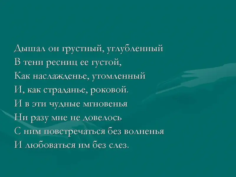 Полюбив, Тютчев уже не умел, не мог разлюбить. Любимая женщина являла для него как бы полнозвучное воплощение целого мира - неповторимое, но все же несущее в себе именно все богатство мира, воплощение.