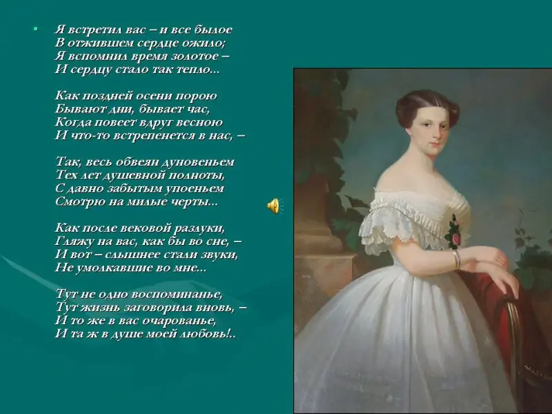 А спустя почти 40 лет, случайно встретившись с ней (в июле 1870 года, когда она была уже во втором браке за графом Н. В. Адлербергом), находясь на лечении в Карлсбаде (ныне Карловы Вары), откликнулся на эту встречу прекрасным стихотворением-воспоминанием, хорошо известным, однако, не по названию «К. Б.», которое биографы Тютчева расшифровали как «Крюднер. Баронессе», а по первой строчке «Я встретил вас - и все былое...»: (слайд №6 с прослушиванием романса в исполнении Олега Погудина).