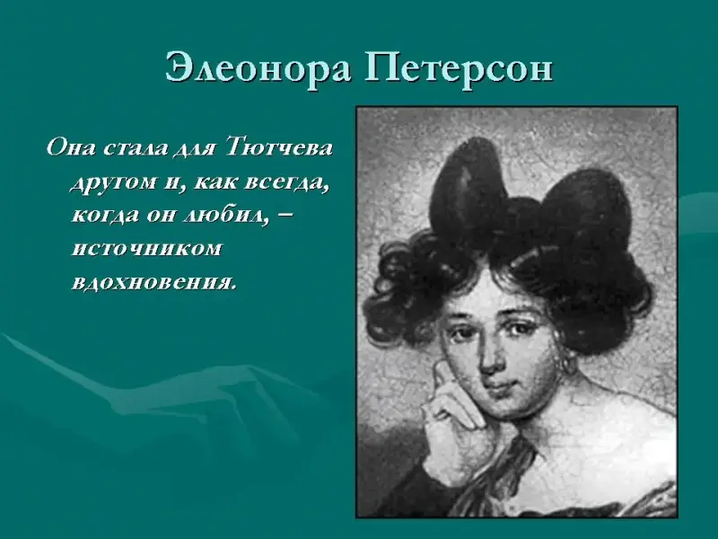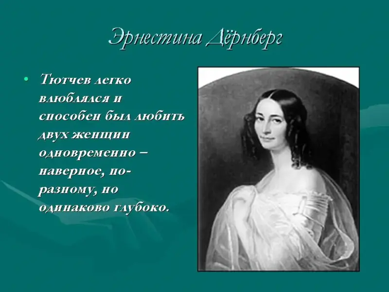 Однажды на балу, произошла первая встреча поэта с будущей второй женой, баронессой Эрнестиной Дёрнберг .Многое осталось скрытым в истории отношений Федора Ивановича Тютчева с Эрнестиной Дёрнберг. Однако дошедшие до нас письменные намеки и отголоски, отрывки из дневников и фрагменты некоторых стихотворений свидетельствуют о том, что это не было чуждое «взрывам страстей» увлечение, подобное любви-дружбе к «прекрасной Амалии». Нет, это была та самая «роковая страсть», которая, по словам самого Тютчева, «потрясает существование и в конце концов губит его».