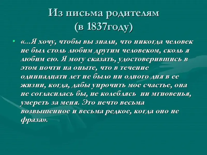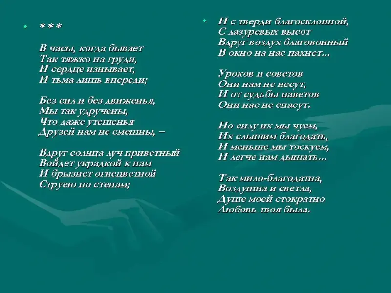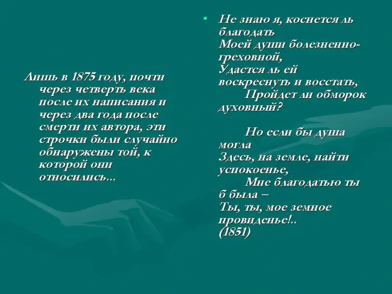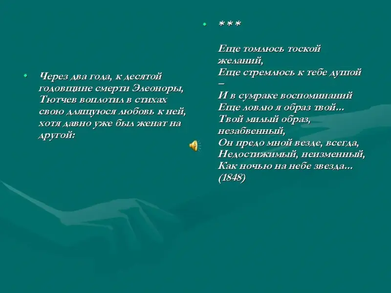 И в то же время письма поэта, остававшегося в Петербурге, к жене в Овстуг показывают, насколько по-прежнему болезненно он переносил разлуку с ней. «...Нет в мире существа умнее тебя, - пишет он ей однажды. - Мне не с кем больше поговорить. Мне, говорящему со всеми». Но, быть может, одним из самых знаменательных и задушевных признаний из когда-либо сделанных поэтом являются стихи, написанные им весной 1851 года: (слайд №17 читает ученик)