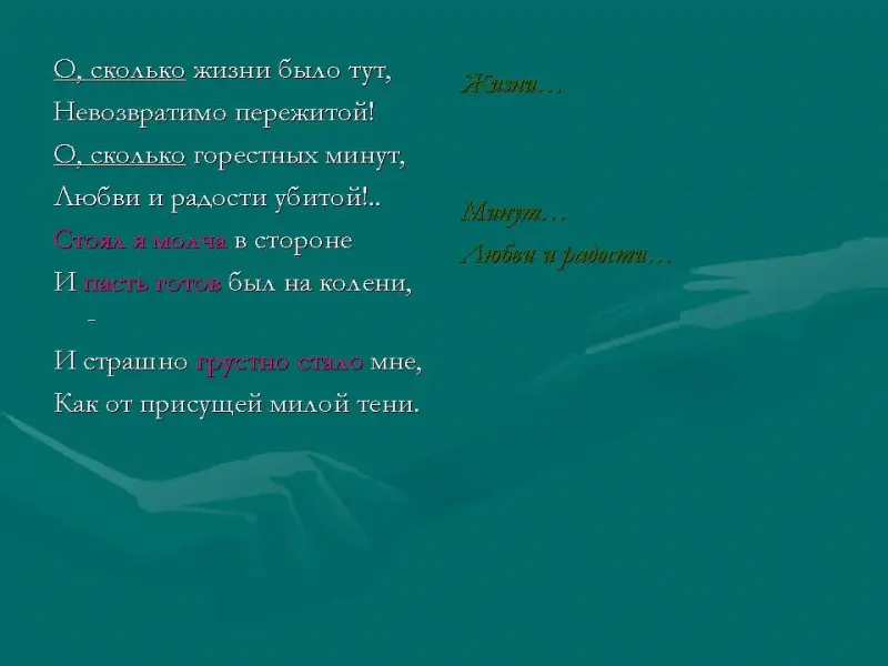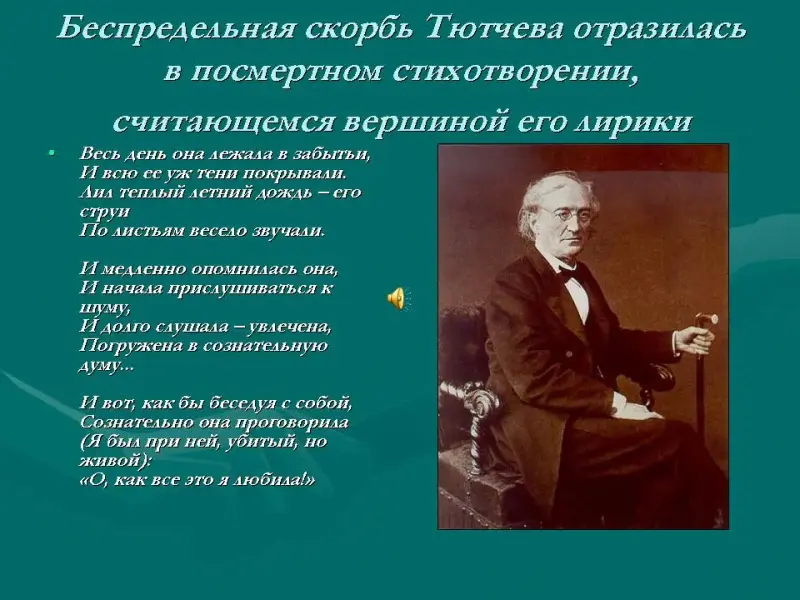 (Слайд № 22 чтение стихотворения «Весь день она лежала в забытьи»,читает учитель в сопровождении мелодии Р. Клайдермана «К Элизе»). Стихотворение «Весь день она лежала в забытьи...» - последнее из произведений «Денисьевского цикла». Наверное, никто из русских поэтов, кроме Тютчева, не сумел с такой трагической силой' передать чувства, вызванные утратой любимой. Стихотворение посвящено воспоминаниям о последних часах жизни Е.А. Денисьевой. Смерть любимого человека, подарившего ему последнее блаженство любви, убила в нём даже желание жить, и последние 9 лет он просуществовал под постоянным нестерпимым гнётом мучительного позднего раскаяния.