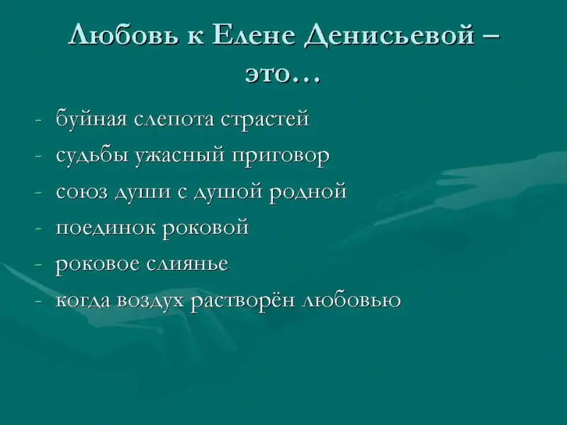 (слайд №21) Любовь в Денисьевском цикле - любовь роковая, но все дело в том, что у Тютчева грозную роковую силу несут сами герои.