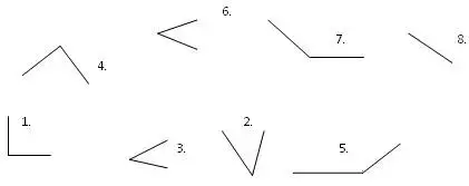 - Найдите похожие углы. Запишите их номера отдельными группами. (Группа I: 1, 4, 8 - прямые углы; группа II: 2, 3, 6, - меньше прямого; группа III: 5, 7 - больше прямого.)
