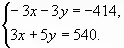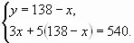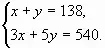 Пусть х аршин было черного сукна, а у аршин - синего. Всего купец купил 138 аршин сукна, составляю первое уравнение системы: х+у=138. Так как 1 аршин черного сукна стоит 3 рубля, а 1 аршин синего - 5 рублей, то за все черное сукно уплачено 3х рублей, а за все синее - 5у рублей. Вся покупка стоит 3х+5у рублей. Так как купец истратил на всю покупку 540 руб., то 3х+5у=540.