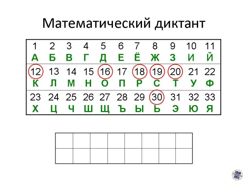 - В ответах математического диктанта зашифровано слово. Чтобы расшифровать его, нам поможет алфавит русского языка.
