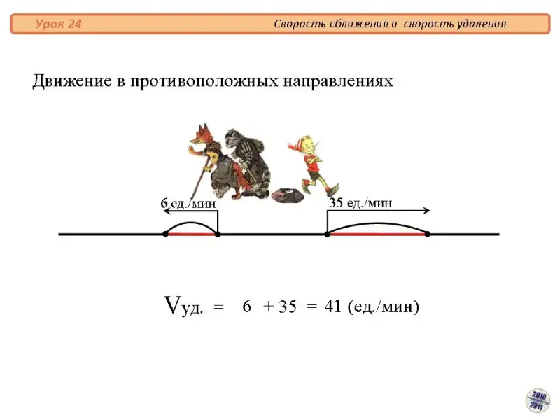 Кот Базилио с лисой Алисой и Буратино разошлись с Поля Чудес в противоположных направлениях со скоростями 6 ед./мин и 25 ед./мин. Как и с какой скоростью изменится расстояние между ними? - Переход на Слайд 9 "Задача на встречное движение".