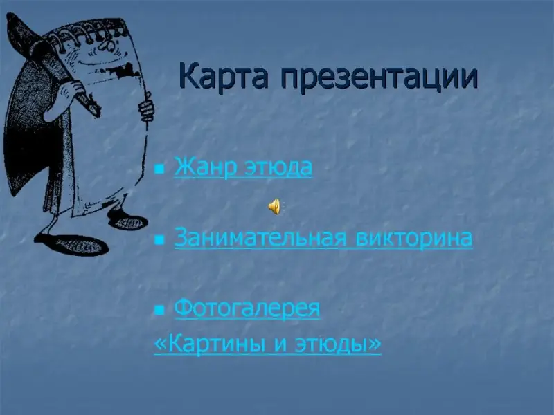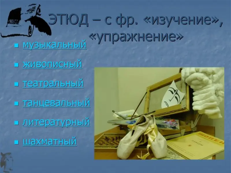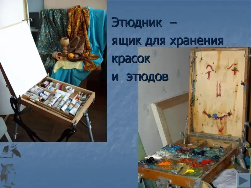Преподаватель: Конечно, к изобразительному искусству (Слайд 22). Слово "этюд" мы нередко встречаем в книгах по изобразительному искусству, на выставках, в картинных галереях. Если художник говорит, что он отправился на этюды, это значит, что он идет писать с натуры. Готовые этюды он затем складывает в специальный ящичек - этюдник (Слайд 23).