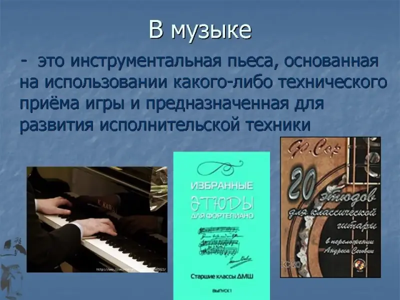 - в музыке - это инструментальная пьеса, основанная на использовании какого-либо технического приема игры и предназначенная для развития исполнительской техники (Слайды 3,4);