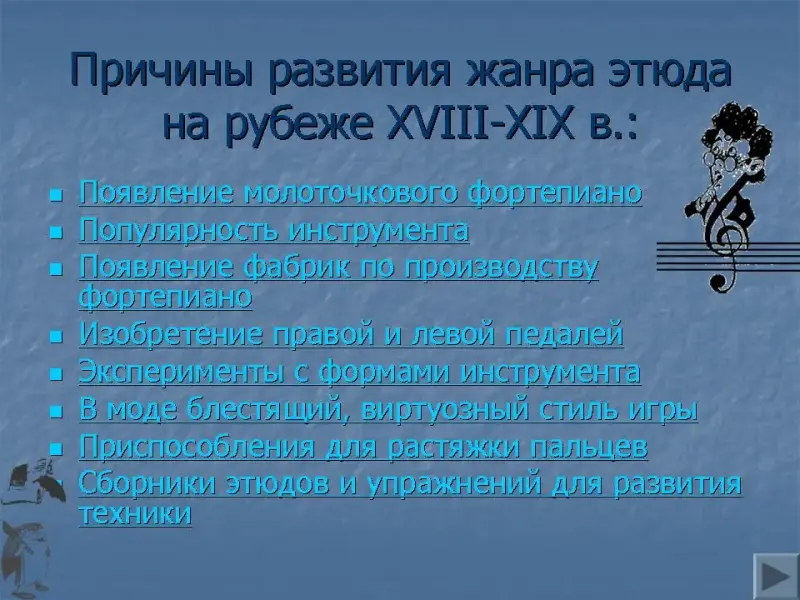 - появляются целые сборники этюдов и упражнений для развития фортепианной техники (Слайды 5, 13).