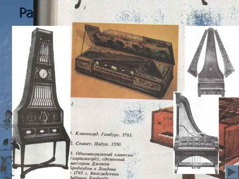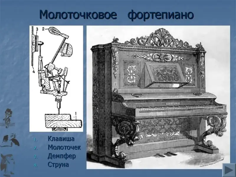 - на смену клавесину и клавикорду с их разновидностями приходит молоточковое фортепиано, инструмент, открывающий богатейшие возможности для исполнителя (Слайды 5, 6);