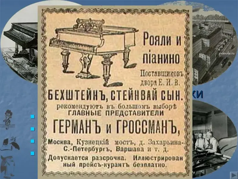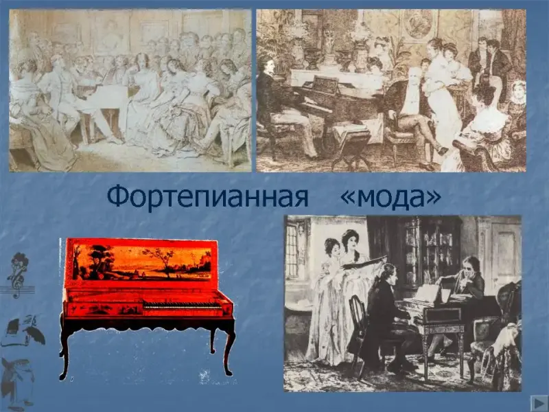 - начинается настоящий фортепианный бум, мода на этот инструмент приводит к широкому его использованию в домашнем быту, для обучения музыке (Слайды 5, 7);