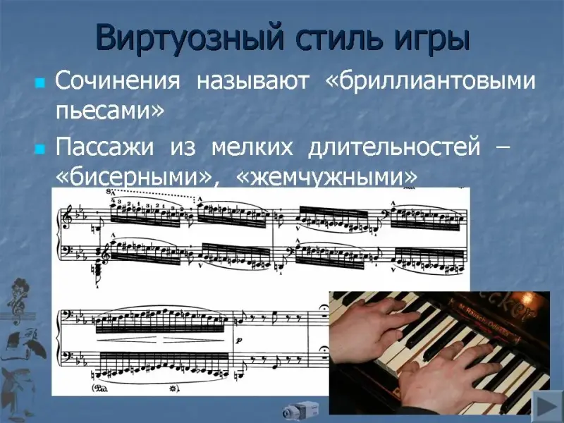 - в моду входит блестящий, виртуозный стиль игры. Сочинения, написанные в таком стиле, называют "бриллиантовыми пьесами". Отличаются они обилием мелких пассажей, т.н. "бисерных, жемчужных" (слайды 5, 11, видео "бисерные пассажи" - Евгений Кисин исполняет фрагмент "Кампанеллы" Листа);
