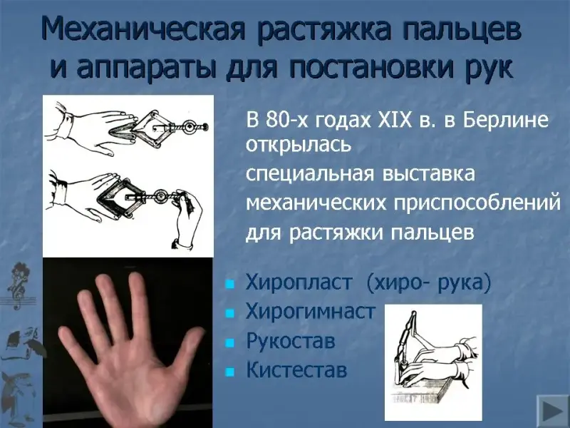 - чтобы добиться максимальной виртуозности исполнители даже применяют всевозможные механические приспособления для растяжки пальцев и правильной постановки рук. Их названия нам сейчас покажутся смешными: хиропласт, хирогимнаст (от "хиро" - рука), рукостав, дактилион (от "дактиль" - кольцо). Вставив руку в такой инструмент, исполнитель мог спокойно читать книгу, его пальцы упражнялись сами (Слайды 5, 12);