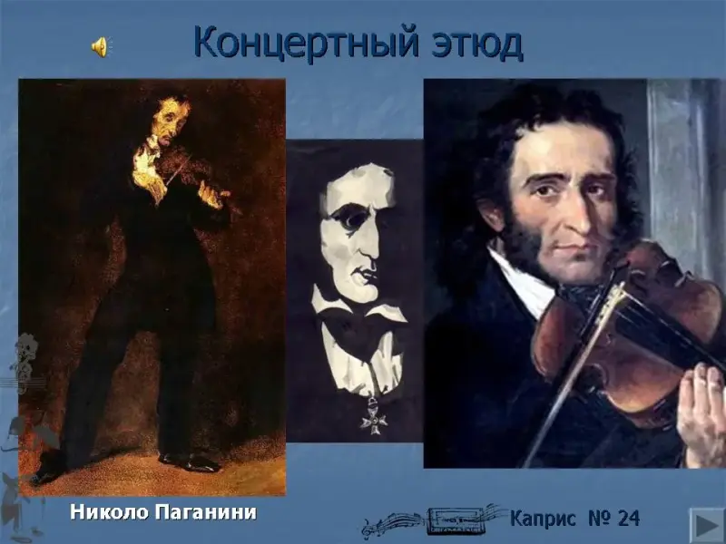 Первопроходцем в этом направлении по праву считают итальянского скрипача-виртуоза Н. Паганини (Слайд 14 - портрет Паганини). Весь его демонический образ, высочайшая степень виртуозного владения скрипкой, приводили публику в изумление и даже в шок. Особенно впечатлительные барышни на его концертах даже падали в обморок. "Человек не может так играть" - заявляли завистники и называли Паганини "дьяволом со скрипкой".