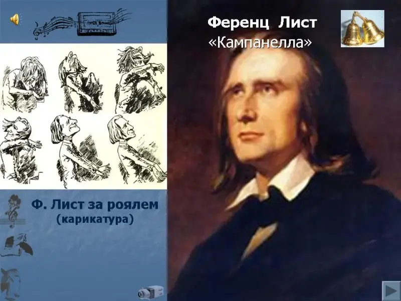 Преподаватель: Темы Паганини вдохновляли многих композиторов. Венгерский композитор Ференц Лист для создания одного из шедевров виртуозной музыки "Кампанеллы" тоже взял одну из тем Паганини (слайд 15 - портрет Листа).