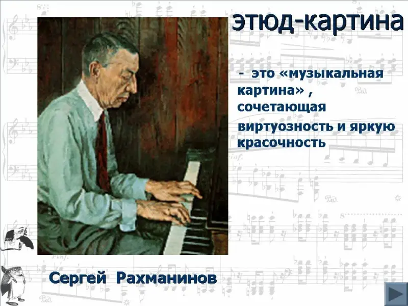 Ряд фортепианных произведений Рахманинова имеют оригинальное название - этюд-картина (Слайд 16 - этюд-картина).