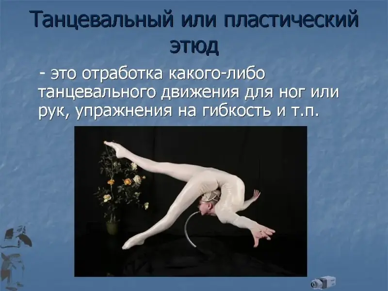 - этюд танцевальный или пластический - это отработка какого-либо танцевального движения для ног или рук (Слайды 3, 19).