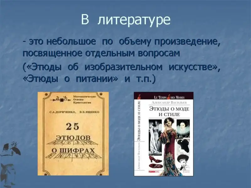 Преподаватель: Итак, начнем с самого близкого и понятного нам - этюда музыкального (Слайд 4). Первоначально этюд трактовался как музыкальная пьеса типа упражнения для совершенствования технических навыков игры на каком-либо инструменте. В период с конца XVIII и начала XIX века появилось множество композиторов, которые писали этюды.