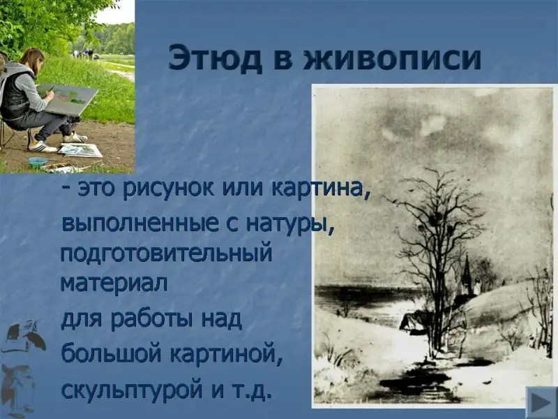 Посмотрите живописные работы известных художников и определите, какие произведения являются этюдами (Слайды 29-31).