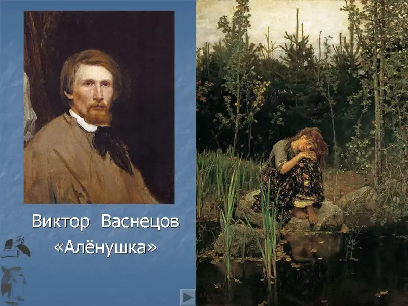 Учащиеся: рассматривают репродукции известной картины Васнецова "Алёнушка" и этюды к ней, находят и разбирают отличия (Слайды 24-26).