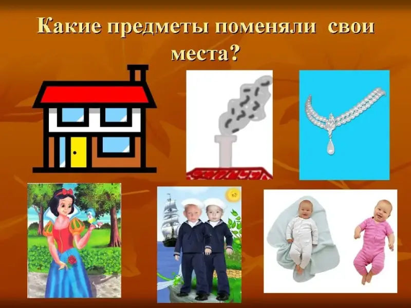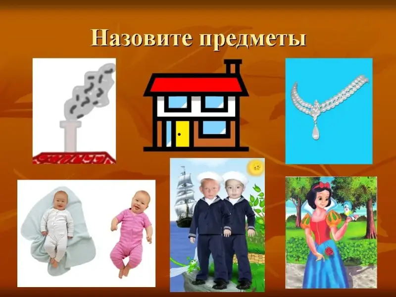 После этого учитель распределяет изображённые предметы на две группы. В первой группе: дым, дом, бусы. Во второй малыши, моряки, Белоснежка.