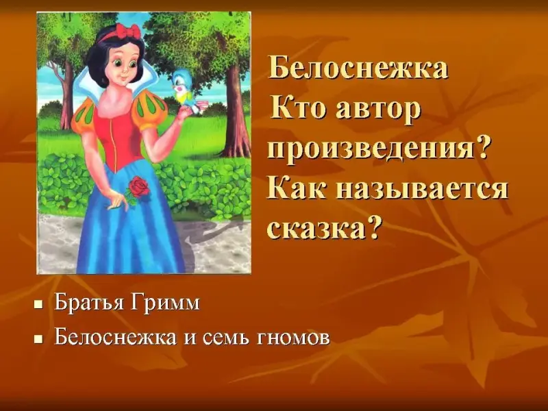 У нас в гостях сегодня Белоснежка. Это героиня какого произведения? Кто автор? (слайд 10)