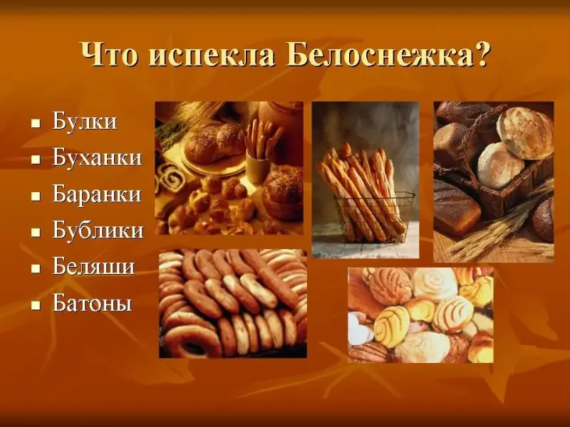Пока гномы работали Белоснежка решила приготовить для них обед. Начала она печь. Вспомните тему урока и назовите изделия, которые испекла Белоснежка.(Булки, буханки, баранки, бублики, беляши, батоны) (слайд 13)