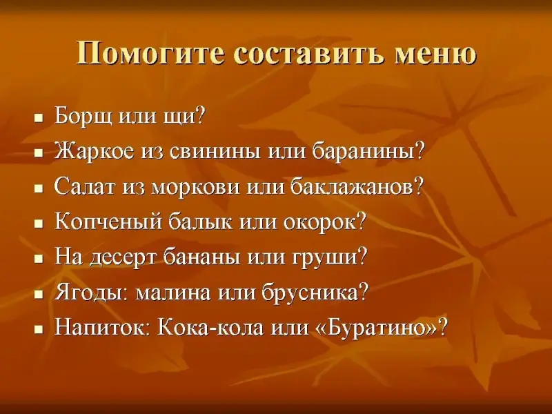 Я буду называть по два блюда, а вы выберите нужное.