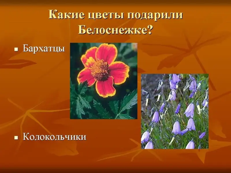 Возвращаясь с работы гномы захватили для Белоснежки целый букет цветов.Какие цветы они ей подарили :бархатцы или колокольчики?(Гномы подарили бархатцы).Охарактеризуйте новый звук в слове бархатцы.(согласный, звонкий, твердый). (слайд 15)