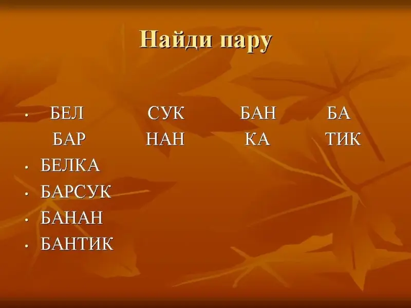 (белка, барсук, банан, бантик)