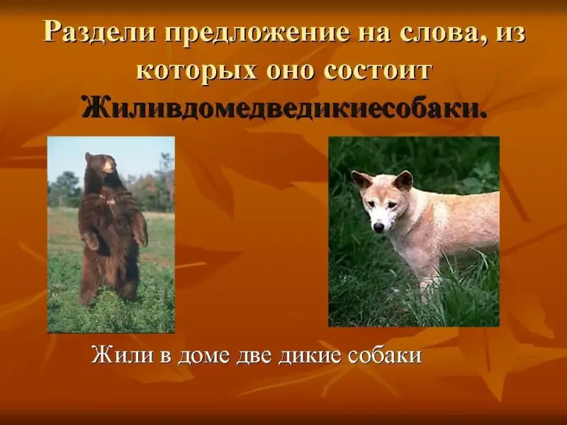 - Жиливдомедведикиесобаки. (Жили в доме две дикие собаки.)