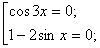 cos 3x (1 - 2 sinx) = 0. Полученное уравнение равносильно совокупности двух уравнений: