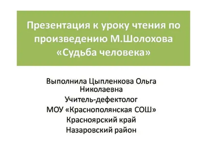 Оборудование: учебник "Чтение" 9 класс для специальных (коррекционных) классов 8 вида, А.К.Аксенова, Москва "Просвещение", 2006г.; слайдовая презентация к уроку, аудиозапись песни "Священная война", видеозапись фильма "Судьба человека", карточки с тестовыми заданиями, школьный толковый словарь под ред. М.С. Лапатухина, словарь русского языка С.И. Ожегова.