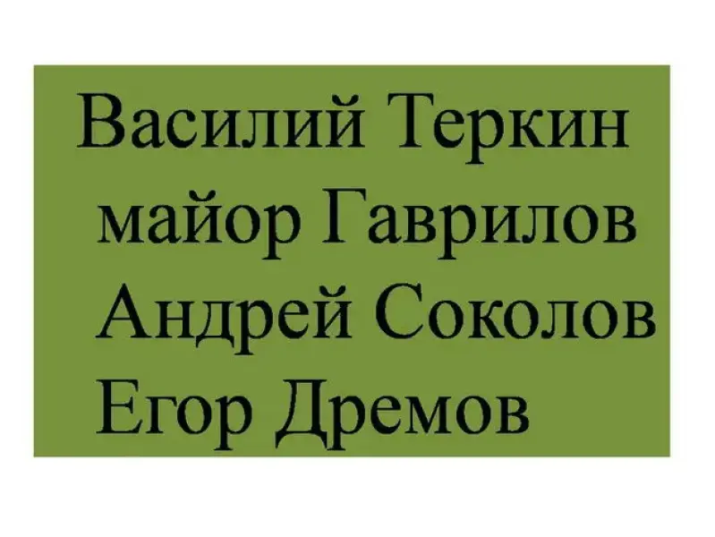 фамилии героев Великой Отечественной войны. Кто из этих людей не является героем литературного произведения? (На слайде 3 написаны фамилии: Василий Теркин, майор Гаврилов, Андрей Соколов, Егор Дремов). (Правильный ответ - майор Гаврилов). Кто может рассказать об этом человеке? (Заслушивает ответы учащихся ). Почему немецкий генерал приказал своим солдатам отдать честь русскому офицеру? Давайте вспомним изученные о войне произведения и соотнесем фамилии героев произведений с иллюстрациями. (Представлены иллюстрации к произведениям "Василий Теркин", "Русский характер", "Судьба человека".) (Презентация 1.ppt, слайды 4 - 7) О ком из этих героев вы должны были прочитать дома? Как называется этот рассказ? |