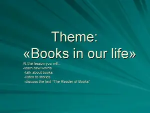 Обьявление темы урока (слайд 1) и задач. The theme of the lesson is “Books in our life.” At the lesson you will learn new words, talk about books, listen to stories and discuss the text “The Reader of Books”.