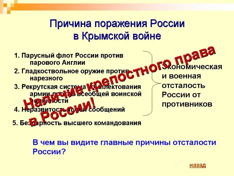 Слайд 19-20. Причины поражения России. Обобщив полученные знания, сформулируйте причины поражения России в Крымской войне. При затруднении воспользуйтесь учебником (стр.87, абзац 2, стр.90, документ 4)