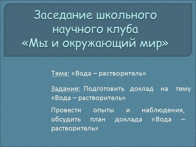 У. С разрешения председателя я хочу сделать первое сообщение. (Слайд 2) Такое же заседание по теме «Вода - растворитель» недавно провели ученики села Мирного. Открыл заседание