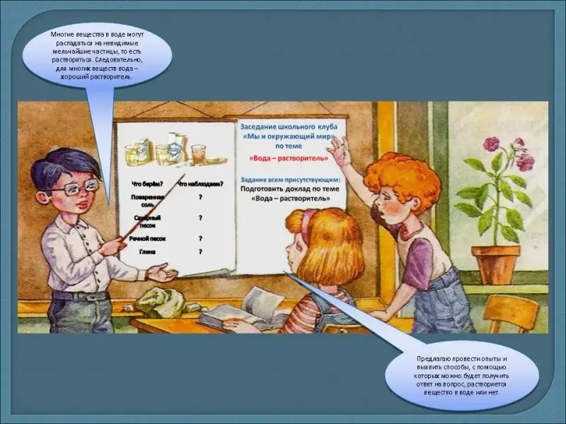 Следовательно, для многих веществ вода - хороший растворитель. После этого Маша предложила провести опыты и выявить способы, с помощью которых можно будет получить ответ на вопрос, растворяется