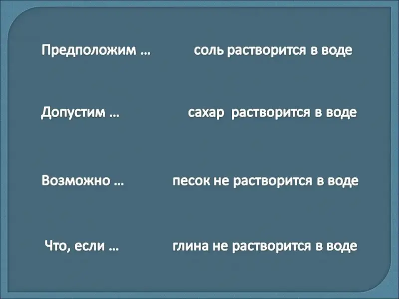 Давайте предположим, какое вещество, по вашему мнению, растворится в воде, а какое не растворится. Выскажите свои предположения, догадки и продолжите высказывание: (Слайд 3)